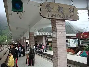 Fenqihu (Chinese: 奮起湖車站; pinyin: Fènqǐhú Chēzhàn) is a railway station on the Forestry Bureau Alishan Forest Railway line located in Zhuqi Township, Chiayi County, Taiwan.