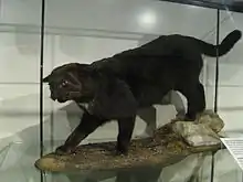 - Felis reyi, proposed by Louis Lavauden in 1929, was a skin and a skull of a specimen from Biguglia in Corsica that was smaller and darker than the European wildcat (Felis silvestris), had a much shorter tail than the African wildcat, and differed in fur colour and markings from both.[29] When Reginald Innes Pocock reviewed Felis skins in the collection of the Natural History Museum, London, he considered Felis reyi a synonym of Felis lybica sarda, the Sardinian wild cat.[30] The Corsican wildcat is considered to have been introduced in the early first millennium. The earliest known fossil records of cats date to the early 14th century, but older chronostratigraphic layers revealed fossils of livestock introduced since the Iron Age.[27]