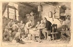 Ferdinand de Braekeleer was born in a poor family.[3] After his parents died he was admitted to the school for orphans and children of poor parents established by the prominent Antwerp painter Mattheus Ignatius van Bree in Antwerp in 1807. At the school de Brakeleer received artistic training as well as reading classes. De Bree rewarded good students with money and gifts.[2][4] De Brakeleer was a good pupil and continued his education at the Royal Academy for Fine Arts of Antwerp where van Bree was also a teacher. He excelled as a pupil and received several prizes in 1809 and 1811.[2]