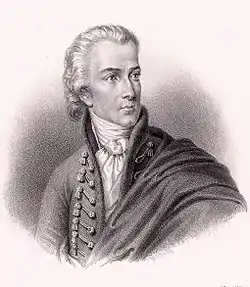 His emotional world was refined by the saloon life of Kassa, whose social pleasures he felt as delightful as the Freemasonry ceremonies which he often attended. His desires were tense between Teréz Radvánszky and Zsuzsanna Kácsándy. For the "nice companies" gathered in the saloons of the Török, Kácsándy and Bárcsay families and for female members of the Freemasonry he addressed his Bácsmegyeynek öszve-szedett levelei (English: Collected letters of Bácsmegyey) in 1789. It was a translation of Albrecht Christoph Kayser's Adolfs gesammelte Briefe which was a pastiche of Werther.[7] This form of translation, which differs from the principle of faithful translation followed during his works on the Gessner Idylliumi, was common in Hungarian literature at that time, but not in such a way as Kazinczy did in his Bácsmegyeynek öszve-szedett levelei. He moved the figure and scene of Kayser's original novel into the role of his friends and into the scenes of their frequent gatherings which showed a rare example of personal self-expression in translation. In some cases his protagonist openly attacks the estates of the realm as a limitation of freedom for humans and emotions. The first edition was indeed a great success in Hungarian public life. Ádám Pálóczi Horváth, János Földi, Mihály Csokonai Vitéz, Sándor Kisfaludy, Mihailo Vitković and Benedek Virág enthusiastically welcomed it.[7] However Kazinczy also received criticism from conservative writers and from his teachers in Sárospatak.[14]