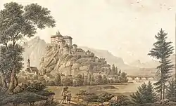 He stayed in Buda until September 27. Then he was taken to Brünn (today Brno, Czech Republic), in the prison of the Špilberk Castle where he arrived on October 7. He lived in a damp, underground jail and got so sick that he could not get up from his bed. Sometimes his stationery were taken away from him; then he wrote with rust paint and rarely with his own blood. He used as pen a kneaded tin piece from the window. When he was allowed to use pen and ink he sat at his table and corrected his earlier translations or was working on new ones.[21] Later his life conditions became better. On the order of Archduke Joseph he was placed on an upper floor on December 21 where he could live at his own expense and could use his books.