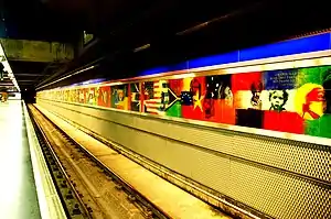 Feria de Madrid (previously Campo de las Naciones)[1] is a station on Line 8 of the Madrid Metro. It is located in fare Zone A.[2] It gives service to IFEMA, an event center which holds, among other trade fairs, the Cibeles Madrid Fashion Week. It's also next to Parque Juan Carlos I, one of the most important parks in Madrid.