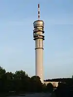 The Schweriner Fernsehturm is a 136.5-metre-tall communications tower built of steel-concrete between 1960 and 1964 in Schwerin, Germany. Unlike most other TV towers, the ground plan is a spherical triangle and not a cylindric cross section. Also its tower basket, which also contains a restaurant, has no round form, but looks instead like a triangle with round sides. From 1991 to November 28, 1999, the restaurant was closed. In the neighbourhood of this tower at 53°35'30,98" N and 11°27'19,8" E, there is a 273-metre-high, radio mast for FM-radio and TV.