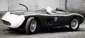 The 1956/7 500 TRC was an altered version of the successful 500 TR of the previous year. The most significant changes were made to comply with Annex C of the International Racing Code, resulting in the "C" added to the model's name.[21] In order to follow these regulations, Ferrari widened the cockpit, added a passenger side door, fitted a full width windscreen with wipers, installed a 120 liters (32 U.S. gal) fuel tank and even added a stowable convertible top. The Scaglietti-built body, while similar to that of the 500 TR, had a lower hood and slightly reshaped wheel arches and fenders. Another change from the 500 TR was the longer 2,350 mm (93 in) wheelbase, derived from the 860 Monza. Suspension featured coil springs all around with a live rear axle. Like the 500 TR, the car weighed only 680 kg (1,500 lb), and produced 180 hp (132 kW).[21] [20] [22] Ferrari manufactured a total of 19 500 TRC chassis between 1956 and 1957. This model was the last 4-cylinder racing car built by Ferrari.[22]