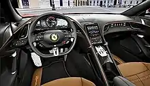 The interior is focused on the dual cockpit theme, featuring separate driver and passenger cells. It is described as a "2+" interior by Ferrari with a small backseat area. The dashboard features digital instrumentation (a 16.0-inch wrap-around touch screen) and a multi-function steering wheel (both shared with the SF90 Stradale) for the driver. The trim piece running through the centre of the interior separates the driver and the passenger and is integrated seamlessly into the dashboard. A centrally-mounted 8.4-inch portrait touch screen controls most of the car's functions. A third horizontal touchscreen can be integrated into the dashboard on the passenger side of the cockpit. This display allows the passenger access to the HVAC controls along with multimedia and navigation controls. The passenger can also view the performance metrics of the car. This third touchscreen emphasizes the passenger's role as navigator and co-pilot. A newly designed key allows the driver to open the doors of the car by the push of a button near the flush door handles of the car.[8][9][10][11][6]
