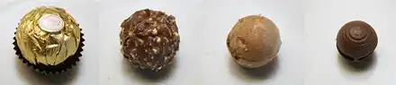Each Ferrero Rocher ball is covered in foil and placed into a paper liner. The confection is machine made and much of its production process is designed to be secretive.[1]