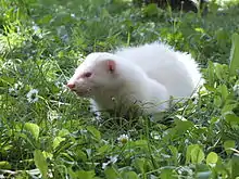 A high proportion of ferrets with white markings which form coat patterns known as a blaze, badger, or panda coat, such as a stripe extending from their face down the back of their head to their shoulder blades, or a fully white head, have a congenital deafness (partial or total) which is similar to Waardenburg syndrome in humans.[30] Ferrets without white markings, but with premature graying of the coat, are also more likely to have some deafness than ferrets with solid coat colors which do not show this trait.[31] Most albino ferrets are not deaf; if deafness does occur in an albino ferret, this may be due to an underlying white coat pattern which is obscured by the albinism.[30]