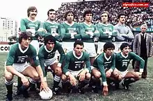 Ferro finally won its first title at Primera in 1982, winning the Nacional tournament after beating defending champions Quilmes in the finals (0–0, 2–0). The squad played a total of 22 matches, winning 16 with 6 draws so they won the championship remaining unbeaten.[9] Ferro scored 50 goals and conceded 13. Left wing Miguel Angel Juárez was the top scorer with 22 goals. Other notable players for the champion team were Adolfino Cañete, Alberto Márcico, Juan Domingo Rocchia, and Héctor Cúper.[10]