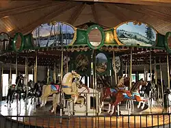 While the exact date this carousel was built is not known, the simple styles of the horses show it to be from the beginning of the golden age of carousel building in America, between 1890 and 1900. Constructed in the style common for transportable "Country fair" the carousel features two rows of twelve horses each.[1][3] The carousel was made by either the Armitage Herschell Company or the Herschell Spillman Company.[2][3] During the golden age of carousels an estimated 2,000 to 3,000 carousels were built by a number of different companies. Of that estimated number only 208 were listed in the National Carousel Associations 2000 census. The original owner and destination of the carousel is unknown. Belly mounts on the horses indicate the carousel was originally track driven, but the track mechanism was replaced at some point with a 1935 mechanism built by Hatfield Engineering, when the entire carousel was refitted to the jumping format present today.