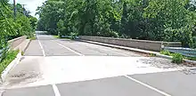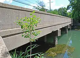 The Ferry Street Bridge has a main span length of 26 feet (7.9 m), a structure length of 95 feet (29 m), a roadway width of 36 feet (11 m), and a structure width of 28 feet (8.5 m).[2] The railings are solid concrete, and marble plates mounted at the northeast and southeast corners of the bridge note that the bridge is Job 413 of the Wayne County Road Commission.[2] Three bents with square concrete posts support the bridge.[2] The bridge is a continuous concrete slab, used by the road commission during World War II and immediately after, presumably due to the difficulty of obtaining steel.[3] The bridge is considered a good representative example of this type of bridge, retaining high integrity.[4]