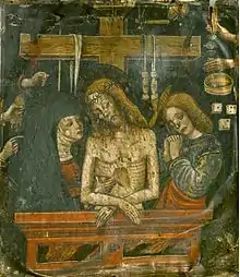 A waitress, gone upstairs to take clean sheets, noticed that the little painting of the Man of Sorrows, representing Jesus between the Virgin Mary and Saint John, was bleeding. The day after a little bleeding rib, proportionate to the painted Christ, was found under the painting.