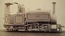 Officially the line's gauge was 1 ft 11+34 in (603 mm), however, a Board of Trade inspection in 1868 recorded it as 1 ft 11+14 in (591 mm), as did the locomotives' manufacturer's catalogue, repeated in the magazine "Engineer". A survey of the line conducted by Vignes in 1878 gave the gauge as 1 ft 11+12 in (597 mm).[4] In practice the tolerances were sufficiently wide to allow Festiniog Railway locomotives and rolling stock to use the line, but there is no record of F&BR stock venturing onto FR metals other than transit to Minffordd when their two locomotives made rare visits to Wolverhampton for heavy repair.[5] They are unlikely to have made these trips along the FR in steam and may even have travelled on flat wagons.
