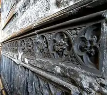 - William Bourchier, 9th Baron FitzWarin (1407–1470), husband of Thomasine Hankeford, 9th Baroness FitzWarin (1423–1453).[36] He was the 2nd son of William Bourchier, 1st Count of Eu (1386–1420) by his wife Anne of Gloucester (1383–1438), eldest daughter of Thomas of Woodstock, 1st Duke of Gloucester (1355–1397) (by his wife Eleanor de Bohun), youngest child of King Edward III. He was summoned to Parliament as Lord FitzWarin in right of his wife and is thus deemed to have become 9th Baron FitzWarin. William Bourchier had three distinguished brothers: Henry Bourchier, 1st Earl of Essex (1404 – 4 April 1483), eldest brother; John Bourchier, 1st Baron Berners (1415–1474), younger brother; and Thomas Bourchier, (c. 1404 – 1486), Archbishop of Canterbury and a cardinal, youngest brother. His sister Eleanor Bourchier, (c. 1417 – 1474) married John de Mowbray, 3rd Duke of Norfolk. Thomasine was buried in Bampton Church,[37] and the surviving fragments of a tomb chest there re-set into the north wall of the chancel and displaying in a row within quatrefoils Bourchier Knots alternating with water bougets of the Bourchier arms is said by Pevsner to be that of Thomasine Hankford (died 1453), wife of William Bourchier (1407–1470)[35] William Bourchier died before 12 December 1469[38] and was buried in the Church of the Austin Friars in London. His will was dated at Bampton 13 February 1466/7.[38]