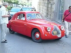 The novel coupé body had a peculiar but highly aerodynamic shape, characterised by a flat, elongated roofline, an abruptly cut off tail, and some very modern traits like an uninterrupted fender line and smooth sides—a first on a Fiat.[10] As the Mille Miglia model was developed mainly to help promote the new 508 C by competing in motor racing, the chassis had to be carried over from the saloon and couldn't be lowered or altered to reduce the frontal area. Therefore in order to up the car's top speed Fiat's Ufficio tecnico vetture (motor car engineering and design department, headed by Dante Giacosa) had to optimise the body shape to lower its drag coefficient—even at the cost of sacrificing interior room and rear visibility.[11] According to Giacosa inspiration for the sports coupé's body came from observing that during test runs a prototype 500 Topolino-based van could reach a higher top speed than the saloon it was based on. The shape of the body was then perfected using a number of 1:5 scale models and the wind tunnel of the Politecnico di Torino university.[12]