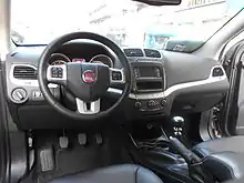 As a mid-size CUV, the Journey was available in five and seven passenger configurations and was noted for its overall packaging and seating flexibility — which included a front passenger seat with under-cushion storage and fold-flat capability; second-row for-aft sliding, reclining, fold-flat seating with an H-point 1.6 inches (40 mm) higher than the front row (aka theater seating); latching under-floor storage with removable bins; available twin booster seats and single-hand-operable third row access; available twin fold-flat third-row seats and an aft under-floor storage compartment.[8] Trim levels varied over model years, to include various options with entertainment/infotainment, cloth or heated leather seats and heated steering wheel as well. Additionally, rear doors opened to 90-degrees, rare for any offerings by the Big Three (automobile manufacturers).[8]