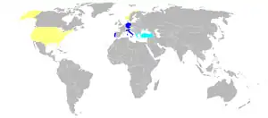 On 6 September 1961, the first G.91 R/4 was delivered to the Hellenic Air Force (HAF) for evaluation purposes.[49] The G.91 R/4 variant, of which 25 aircraft were intended to be delivered to both Greece and Turkey, employed the same armament as the G.91 R/1 while using the equipment of the R/3 variant. However, both Greece and Turkey would ultimately not induct any G.91s, these aircraft were instead passed onto Germany's inventory instead.[49]