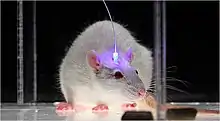 Miniscopes[36][37][38][39] are head-mounted, miniature microscopes that allow imaging of large populations of neural activity in freely-behaving mice and rats. This is possible due to their small size, as they are light enough for a mouse or rat to easily carry without interfering greatly with behavior. Researchers couple miniscopes with implanted gradient-refractive-index (GRIN) lenses or cortical windows that enable deep and superficial brain imaging.[38][5][40] This method is ideal for monitoring the activity of hundreds of genetically- and spatially-defined cells within a single animal.[37] As compared to fiber photometry, miniscopes allow imaging with high cellular resolution, detecting changes in calcium within individual neurons and non-neuronal cells.[36] Additionally, this method enables repeated imaging over time to analyze the transition from 'healthy' to pathological states or changes over the course of behavior.[37] However, this method of imaging has low sensitivity and high noise, producing lower resolution imaging compared to other multi-photon methods like two-photon.[7] These miniature microscopes are limited in their ability to detect far-red-shifted indicators that would be necessary for combination of optogenetics and calcium imaging here, as is discussed above.
