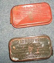 This dressing, already developed in 1904, and subsequently introduced in 1906, was supplied to the troops in a sealed brass casing, to protect the bandage inside against gas attacks, and to also ensure that it remained sterile. An improved version was introduced in 1940, designated First-Aid Packet, U.S. Government – Carlisle Model to tackle the problem of front line wounds and casualties. The Carlisle Bandage underwent a number of changes in its development during WW2. In summer of 1940, U.S. Army, Carlisle Model Small First-Aid Dressing made its appearance. It was contained in a waxed rectangular tuck-end carton, printed with the required markings. Considerable difficulty was encountered in the procurement of the first aid packet. During the Army expansion of 1940, approximately eight million were required for initial stock of equipment In the middle of 1941, the Medical Department decided to amend their specifications, and placed purchase orders for containers made out of tin (instead of brass). The new version was introduced by fall of 1941, together with the very first Sulfanilamide Shaker Envelopes. During the early part of 1943, a plastic container (called Tenite) was developed and put into production, but under field conditions the package warped and broke open. In the course of 1943 the items were wrapped in laminated paper, reinforced with aluminum or lead foil, and covered internally with either pliofilm, cellophane, or polyvinyl butyral and placed inside an appropriate waxed cardboard shell. The small Carlisle model first aid dressing measured approximately 4"X2"X1". When opened, its 1/2"-thick pad measured 7"X4" and had two long gauze tietapes.[2] The Large Carlisle model first aid dressing measured approximately 11 3/4"square. Brief instructions were stenciled on the bandage in red ink. Most packaging included the word "Sterile" and the directions "Red color indicates back of dressing – put other side next to wound." If a dressing was "camouflaged" it was olive drab in color. Detailed explanations and photos concerning the application of dressing to wound were included in a printed manuals for US soldiers.[3][4][5]