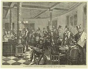 President Ulysses S. Grant's 1867 presidential campaign began at a dinner party in the hotel, and he and his cabinet once held an official session there.[12] On September 20, 1873, Grant came to New York in response to the start of the financial Panic of 1873, and held a serious of meetings at the hotel the next day with financiers, brokers, bankers and railroad executive, all wanting Grant to take steps to stabilize the economy, but Grant lacked the tools which later presidents would have to deal with the economy, as there was no central bank, no Federal Reserve system, to take necessary measures. After the presidential campaign of 1880, in which Grant campaigned for James Garfield, he and his wife Julia moved into the hotel for the winter.[13]