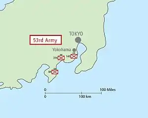 The Japanese 53rd Army was formed on April 8, 1945, under the Japanese 12th Area Army, as part of the last desperate defense effort by the Empire of Japan to deter possible landings of Allied forces in central Honshū during Operation Downfall.[2] The Japanese 53rd Army was based in Isehara, Kanagawa Prefecture and was thus intended to guard the western approaches and beachheads to Tokyo along Sagami Bay.[3] It consisted mostly of poorly trained reservists, conscripted students and Volunteer Fighting Corps home guard militia. It was demobilized at the surrender of Japan on August 15, 1945, without having seen combat.