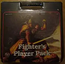 The Fighter's Player Pack is an AD&D game accessory which comes in a case with everything a newcomer needs to get his fighter PC ready for a campaign: a pad of character sheets, a stand-up reference screen, a brief but informative player's guide, seven polyhedral dice, three pewter miniatures, and a shiny red pencil. The case is designed so that a copy of the Player's Handbook can fit snugly inside the lid.[1]