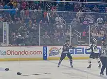 There are several informal rules governing fighting in ice hockey that players rarely discuss but take quite seriously.[97] The most important aspect of this etiquette is that opposing enforcers must agree to a fight, usually via a verbal or physical exchange on the ice. This agreement helps both players avoid being given an instigator penalty, and helps keep unwilling participants out of fights.[98]