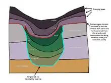 Slumping is a process that can occur to any context in the archaeological record and not just fills. Slumping represents how a context's deposition morphology may deform from its original position by natural settling action. This is readily apparent with fills which have a tendency to settle radically over time. This settling is termed slumping and has a bearing on the excavation of cut features. As fills slump the overlying layers which seal the feature will slump in sympathy creating false impressions of fills below the lip of the cut and introduce the possibility of contaminated dating evidence into the features excavation. (See archaeological section in fig 1). also the degree of slumping of the primary fills compared to the slumping of overlying sealing layers is a possible measure of time differences between the formation of the fills the overlying sequence. This is because sealing layers laid down over a slumping feature with the intent of leveling the area for a specific purpose such as construction will either conform to the slumped fills as though the slump has occurred at the time of the sealing layers formation. Or the sealing layers will not take into account the slumping because the slumping is yet to occur. This can lead to sympathetic slumping up the sequence of other features including later structures.