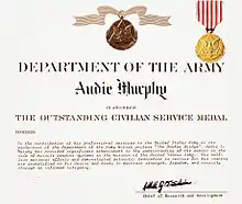 - Dept. of the Treasury. "Medal of Honor with Audie Murphy". U.S. National Archives and Records Administration ARC Identifier 5727074. Retrieved 10 October 2013.