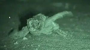 Aquatic reptiles such as sea turtles predominantly use their pectoral flippers to propulse through the water and their pelvic flippers for maneuvering. During swimming they move their pectoral flippers in a clapping motion underneath their body and pull them back up into an airplane position, causing forward motion. During the swimming motion it is really important that they rotate their front flipper in order to decrease drag through the water column and increase their efficiency.[6] Sea turtles exhibit a natural suite of behavior skills that help them direct themselves towards the ocean as well as identify the transition from sand to water after hatching. If rotated in the pitch, yaw or roll direction the hatchlings are capable of counteracting the forces acting upon them by correcting with either their pectoral or pelvic flippers and redirecting themselves towards the open ocean.[7]