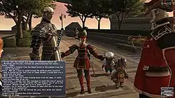 Story related gameplay in Final Fantasy XI consists of two major components: missions, through which the main storyline of the game is told, and quests, which do not advance the main storyline, but fill out the game's fantasy world.[16] Completing missions allows a player to advance in rank, which grants access to new areas, several privileges, and various other storylines. At first, a player may only complete missions for their home nation, though they are able to change allegiances later on, allowing access to other nations' storylines. Quests may be undertaken for their various rewards, or to acquire "fame", which allows a character to become well-known and respected by NPCs; a higher fame rating will open up new interactions and quests with NPCs. At release, over one hundred quests were available to play and each expansion pack has added its own set of missions and quests.[17] Players obtain in-game money known as gil by completing missions, quests and defeating Beastmen, though unlike previous Final Fantasy games, these monsters drop only small amounts. Gil can then be exchanged amongst players for goods through the Auction House, or be used to purchase items and rewards from NPCs.