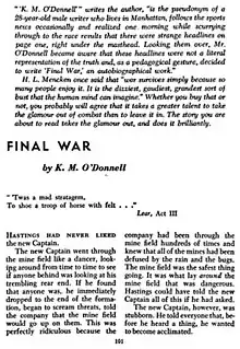 "Final War" is a short story by American author Barry N. Malzberg under the pseudonym K. M. O'Donnell. It was first published in the April 1968 issue of The Magazine of Fantasy & Science Fiction.