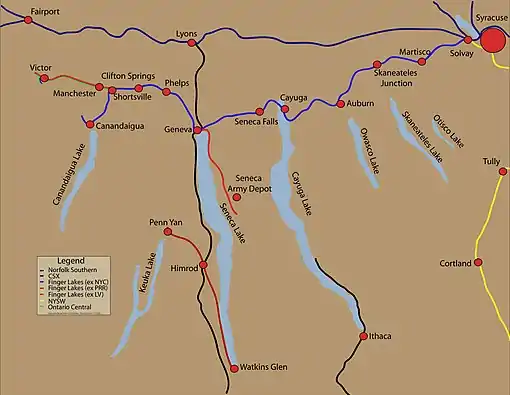 The Finger Lakes Railway (reporting mark FGLK) is a Class III railroad in the Finger Lakes region of New York. The company began operations on July 23, 1995, and operates in Onondaga, Cayuga, Seneca, Ontario, Schuyler and Yates counties. The FGLK operates 18 diesel locomotives on 167 miles (269 km) of ex-Conrail trackage, formerly owned by the New York Central Railroad, the Pennsylvania Railroad and the Lehigh Valley Railroad. Between 2001 and 2013, the railroad operated a heritage railroad known as the Finger Lakes Scenic Railway which offered passenger train excursions.[1][2]