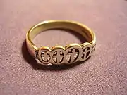 During this period, it was fashionable for several rings to be worn on each hand and each finger. Rings during this period were mostly made from copper-based alloys, silver or gold.[12] Gems became common after 1150, along with the belief that certain gems had the power to help or protect the wearer in various ways.[12] Engraved rings were produced using Lombardic script until around 1350, when it was replaced by Gothic script.[12] Some of the inscriptions were devotional, others romantic in nature.[12][13] For romantic inscriptions, French was the language of choice.[13] An increasing use of contracts and other documents requiring formal seals meant that signet rings became more important from the 13th century onwards.[12]