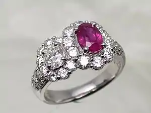 | Cocktail ring | An oversized ladies' ring with a large center stone often surrounded by tiny stones. Nearly any oversized ladies' ring may be termed "cocktail". This is the most common type of costume jewellery ring and is also known as a cluster ring, statement ring and/or dinner ring.[20] | |