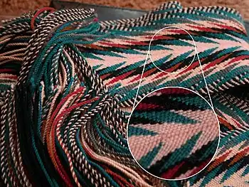 Fingerweaving is a Native American art form used mostly to create belts, sashes, straps, and other similar items through a non-loom weaving process. Unlike loom-based weaving, there is no separation between weft and warp strands, with all strands playing both roles.