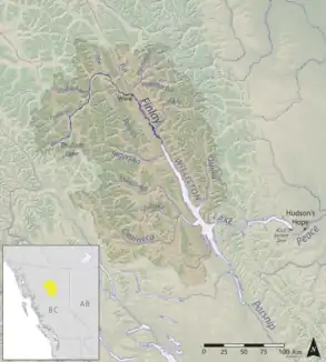 The Finlay River is a 402 km long river in north-central British Columbia flowing north and thence south from Thutade Lake in the Omineca Mountains to Williston Lake, the impounded waters of the Peace River formed by the completion of the W.A.C. Bennett Dam in 1968. Prior to this, the Finlay joined with the Parsnip River to form the Peace. The headwaters of the Finlay at Thutade Lake are considered the ultimate source of the Mackenzie River.[1] Deserters Canyon is located just north of Williston Lake.
