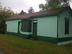 The interior of the depot consists of a freight room at the southern end, the office at the center, and the waiting room at the northern end. The office's trackside bay window is flanked by a wide freight door to the south and a single-leafed five paneled passenger entrance to the north.[1]