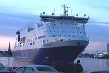 The company first begun carrying passengers in 1962, when the car ferry MS Hansa Express opened a new service linking Hanko, Finland to Travemünde, Germany via Visby in Sweden.[6] The ship was found to be too small from the start, and Hanko a poor choice for the Finnish terminus of the line. The route was altered to Helsinki–Kalmar–Travemünde in 1963, and two large new ferries were delivered for the route in 1966.[7] MS Finnhansa was the larger of the two sister ships, surpassing MS Finnpartner by ten centimeters;[8] it was the largest ferry in the Baltic Sea at the time. Having two ferries year-round proved to be unprofitable and the Finnpartner was sold in 1969.[9] In the late 60s Finnlines developed the Finnflow cargo-handling system, which resulted in the building of the company's first roll-on/roll-off freighters MS Finncarrier, MS Hans Gutzeit and MS Finnfellow.[7]