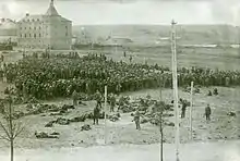 The first prison camps were established at the early stages of war in the White controlled Northern part of Finland.[5] These camps also held 5,000 soldiers of the Imperial Russian Army.[6] In the late March, the number of Red prisoners was only 4,000[2] but after the Battle of Tampere on 5 April 1918, some 11,000 Red Guard soldiers fell into the hands of the Whites and the first large camp was established in the Kalevankangas district of Tampere.[7] Before the Tampere battle, the captured Reds had mostly been shot, but after the collapse of Tampere the number of prisoners was much too large to carry on the executions.[8]