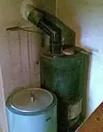 In city apartments, and in most public saunas, an electric sauna stove (kiuas) is used, as it does not require open fire and offers additional features like time delay settings, thermostat and temperature limiter. Also electric saunas usually do have kiuas stones piled over or around the heating element to allow löyly thrown onto them; either as an open, air circulating set-up or as a closed and insulated heat-storing one.[19] Electric sauna offers a possibility for the property manager to control the sauna independently from occupants and limit sauna's electricity use. The control can be remote and wireless and can offer additional settings for sauna lighting, ventilation and steam generating devices.[20] Apartment buildings' sauna is typically offered a few times in a week to occupants with dedicated hours for communal men's and women's sauna, and special hours for those who have requested apartment specific hours. People might prefer the more atmospheric wood stove sauna over an electric sauna, but for those living in urban apartment blocks that is rarely an option, and electric stoves are easier to use, more fire-safe, and don't produce wood litter.[21]