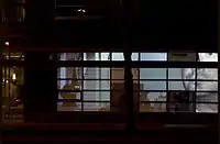 As the viewer draws close to the image, the special glass projection material, Smart glass, causes portions of the imagery to disappear as the projection surface switches from translucent to clear, fragmenting the image and frustrating its coherence: the immediate environment suddenly becomes part of the mis en scene. Thus the viewer is suddenly transitioned from a conventional indexical observer to the here and now; experiencing their immediate environment. Another feature of the work that speaks to the construction and fragility of the image(es), is the rate at which transitions occur from one image (such as a particular individual or background layer of the tableau) to another. These transitions can last up to two minutes, causing individuals pictured or the backgrounds they are set upon to disappear very gradually: creating ghost-like residues of once crisp images as they fade away.