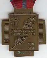 The 1914 – 1918 Fire Cross (Dutch: Vuurkruis 1914–1918, French: Croix du Feu 1914–1918) was a Belgian military decoration awarded to all holders of the so-called "Fire Card" which was awarded to all who came under fire at the front during the First World War. The medal was established by royal decree on 6 February 1934. It could not be awarded posthumously.[1]