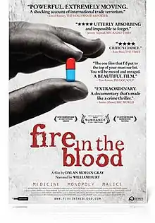Fire in the Blood is a 2013 documentary film by Dylan Mohan Gray depicting what it claims is the intentional obstruction of access to low-cost antiretroviral drugs used in the treatment of HIV/AIDS to people in Africa and other parts of the global south, driven by multinational pharmaceutical companies holding patent monopolies and various Western governments (above all those of the United States, European Union and Switzerland) consistently supporting these companies. The film claims that the battle against what it refers to as a "genocidal blockade," which it estimates to have resulted in no less than ten to twelve million completely unnecessary deaths, was fought and (at least temporarily) won.