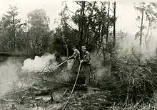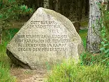 - On 10 August a new forest blaze started near Meinersen which spread towards the village. After the fire was halted shortly before the village, the wind suddenly veered and blew the 20-metre-high (66 ft) flames in a new direction. As a result, a water tender of the Volunteer Fire Service was cut off. Five firefighters from Fallersleben and Hohenhameln died in the wall of fire.