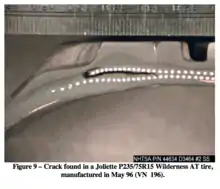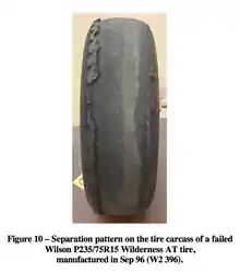 The belt wedge and skim rubber compounds change as they age. Skim rubber is a thin strip of rubber sandwiched between the inner and outer belts and the belt wedge is a thin strip of rubber installed along the outer edge of the tire between the two steel belts and in the area of highest stress on the tire. These changes reduce the ability of the tire to resist crack growth and belt separation.[15] Most of the tread separations occurred on tires that had been in service for at least three years.[15] ATX and Wilderness AT tires manufactured in Decatur started to fail between one and two years after production, but between two and three years for tires from Wilson and between three and four years for tires from Joliette.[15] Tire aging for Wilderness AT tires, regardless of the factory that produced them, was similar to other tires manufactured at Decatur and was worse than comparable tires manufactured by Goodyear.[15]