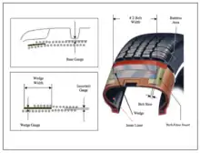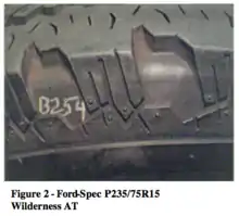 Before May 1998, the belt wedge gauge for ATX and Wilderness AT tires was less than for comparable tires from other manufacturers.[15] The wedge gauge on completed tires was also less than Firestone's minimum standards.[15] The wedge on these tires was not large enough to resist crack formation and growth.[15] The design of the belt wedge changed in May 1998 making it larger and comparable in size to tires manufactured by other companies.