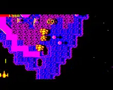 On the BBC Micro version, it automatically detects sideways RAM expansion if present, which allows more detailed graphics on the levels, without any changes to the underlying gameplay. Innovative use of colour makes the 8-colour palette of the BBC look much broader. The scrolling is smooth and flicker-free, and there is very little noticeable slowing, even when many enemies are displayed at once. If shadow RAM is present, the graphics are double buffered.