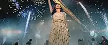 MTV praised Perry's vocals, though felt the lyrics were "clunky".[9] Slant Magazine stated that the song is "not an actively painful listen. Sure, the would-be inspirational lyrics ('Baby you're a firework/Come on show them what you're worth') are nonsensical, ... but the chorus gains some momentum and the song would work well enough in a club setting that you could forgive its otherwise glaring weaknesses."[10] Stephen Thomas Erlewine of AllMusic chose "Firework" among the top tracks on the album,[11] Nick Levine of Digital Spy gave the song five out of five stars, calling it "a straight up self-empowerment anthem wrapped in a Coldplay-on-poppers club banger from the Stargate team. "[12] PopMatters wrote that "Firework" is "the record's last hurrah; though nothing particularly memorable.....'Firework' has at least a bit of staying power".[13] The Washington Post described the song as "too mushy".[14] Al Fox of BBC Music said that the song "displays a breezy maturity and serious set of pipes, a true demonstration of Perry's musicianship without contradicting the kittenish mischief of the bigger picture."[15] The song was nominated for Grammy Award for Record of the Year at the 54th Grammy Awards but lost to Adele's "Rolling in the Deep".