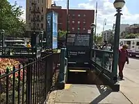The station originally had entrances only at its western end, on First Avenue. Its eastern entrances at Avenue A were built as part of the wide scope in the 2019–2020 rebuilding of the Canarsie Tubes that were damaged during Hurricane Sandy, and to improve service for people living in Stuyvesant Town–Peter Cooper Village, the East Village, and Alphabet City. Work on the entrances began in July 2017,[7][8] necessitating the relocation of bus stops at that intersection.[9] The entrances to the Brooklyn-bound platform were opened on November 4, 2019. The entrance to the Eighth Avenue-bound platform was expected to be opened by the end of 2019,[10][11] but the opening date was postponed to February 10, 2020. This was followed by the temporary closure of the entrances at First Avenue.[12]