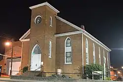 First Baptist Church is a historic African-American Baptist church located at Farmville, Prince Edward County, Virginia. It was built between about 1855 an 1895, and is a one-story, rectangular brick Late Gothic Revival style church building on a full basement. The building features a square tower centered on the primary façade, pointed arch windows with stained- and milk-glass panes, a primary entry with double leaf doors topped by a pointed arch transom and, on the interior, original wood pews and beaded board wainscoting. The church was the site of a number of meetings related to the desegregation of Prince Edward County schools during the 1950s and 1960s.[3]